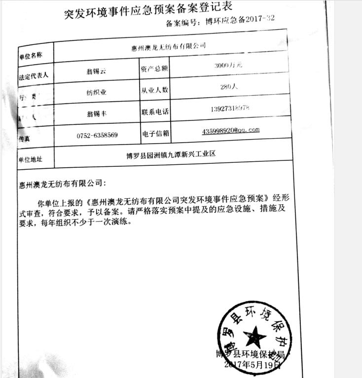 已制订《168飞艇开奖官网直播记录突发环境事件应急预案》,并于2017年 5月19日在博罗县环境保护局备案,
